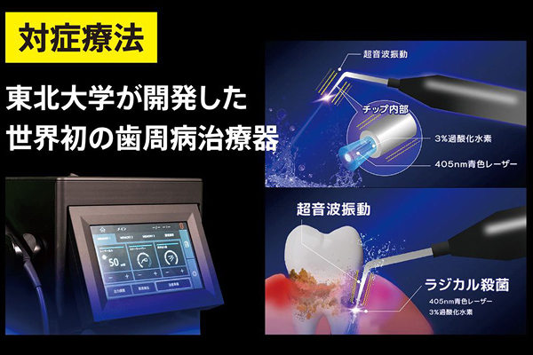 抗菌力を有する過酸化水素水に青色のレーザー光を当てることで殺菌力を向上させ、深い歯周ポケットに潜む細菌を物理的に死滅させることを目的とした機器です。